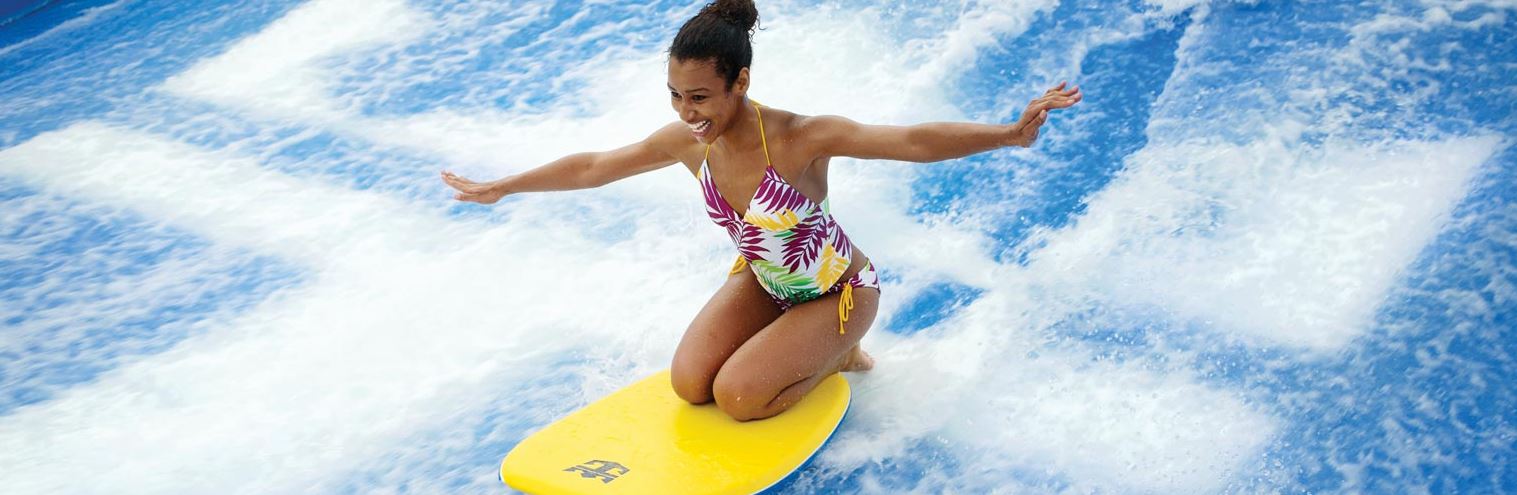 The 40ft Flo Rider surf simulator is available on all Quantum, Oasis, Freedom class ships, Voyager, Explorer and Navigator of the Seas. With 6,000 gallons of fast-moving water, your attempt at surfing on the high-seas is televised on a huge TV screen in the adjacent Wipe Out bar!