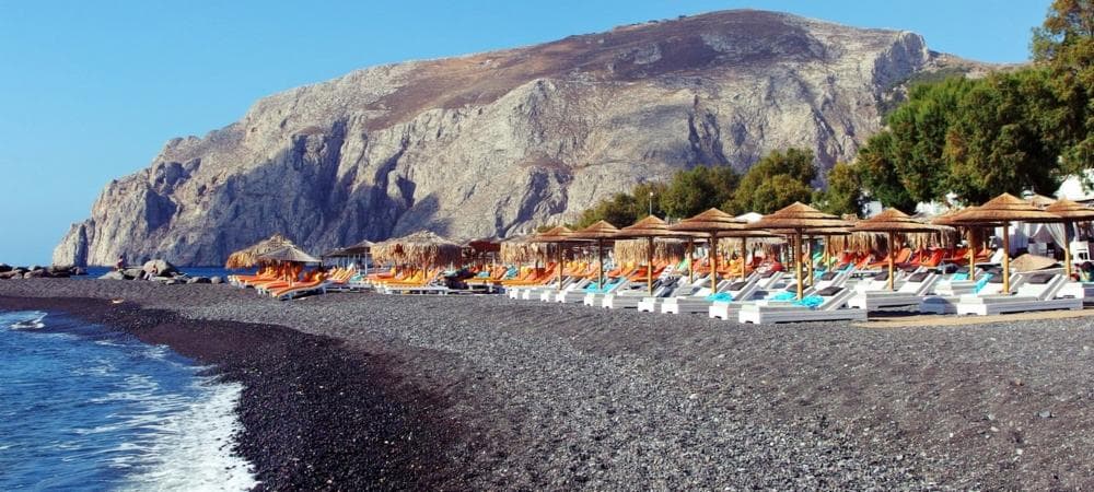 Known for its black sand beach and relaxed atmosphere, lined with waterfront tavernas and cafes.